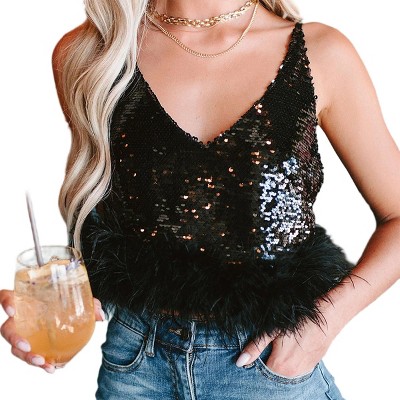 Sequin Top for Women Sleeveless v Neck Sequin Rave Crop Top Furry Fur Trim Shirt Concert Club