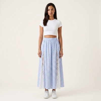 Anna-Kaci Women's Gingham Maxi Skirt Lace Panel High Waist A Line Flowy Lightweight Casual Skirt