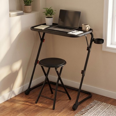 FurnitureR Folding Table and Stool Set, Adjustable Height Tray Table with Tilting Top and Cup Holder, Portable Desk for Bed, Sofa, Study or Outdoor