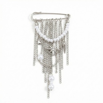 Alilang Women's Safety Pin Brooch with Chain Fringe Tassel Pearl Bead Detail and Star Charm Statement Design - Silver