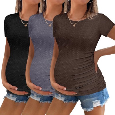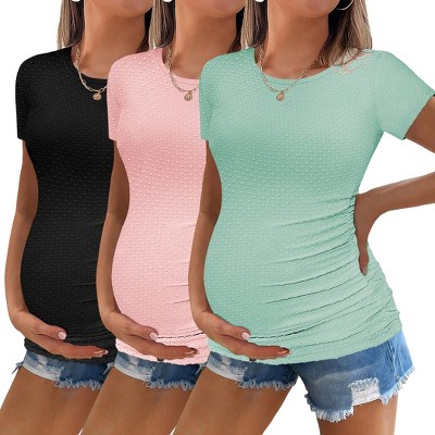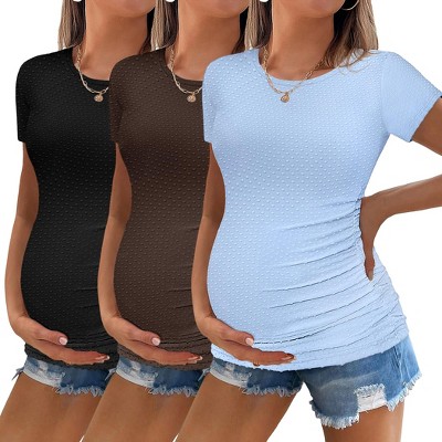 Ekouaer Womens Maternity Shirts 3 Packs Round Neck Short Sleeve Side Ruched Swiss Dot Pregnancy T Shirt Clothes Tops
