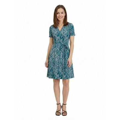 24seven Essential Petite Geometric Print V Neck Short Sleeve Tie Waist A Line Midi Dress