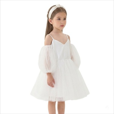 2Bunnies Girls' 3T-8Y Sheer Puff Sleeve Off-Shoulder Tulle Party Flower Girl Dress
