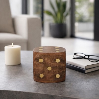 Modern Square Wooden Dice Decorative Object For Shelf Display - Sculptural Figurine Accent For Living Room Decorations or Home Decor - Brown