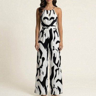 Anna-Kaci Women's Sleeveless Printed Wide Leg Jumpsuit with Halter Neck Waist Tie Detail Relaxed Fit