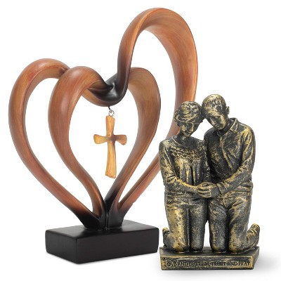 Dicksons Praying Husband and Wife 5 inch Bronzetone Figurine & It Takes Three Heart and Cross 8.5 x 9.5 Brown Pedestal Decoration, Resin Stone Table