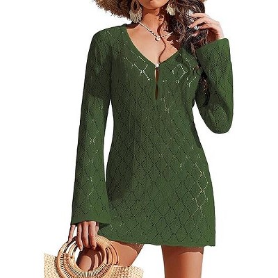 Ekouaer Swimsuit Coverup for Women Crochet Beach Cover Up Hollow Out Long Sleeve Cover Ups 2026 Summer Vacation Outfits Army Green S