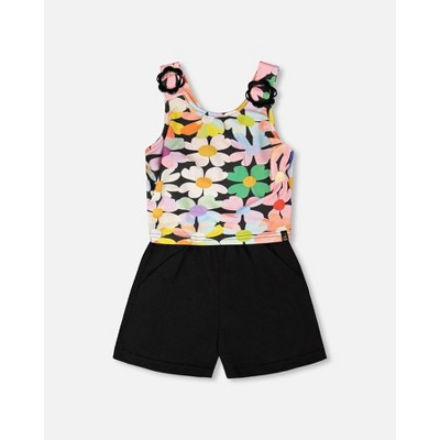 Deux par Deux Girl Sleeveless Jersey Jumpsuit Black Printed Flowers