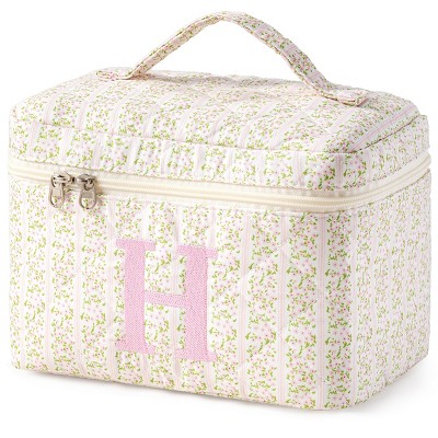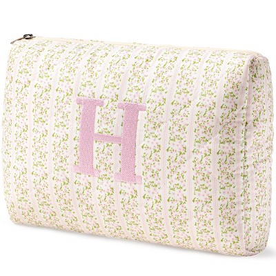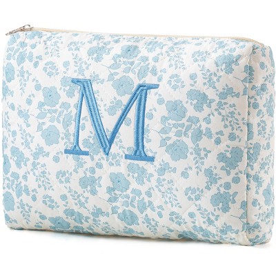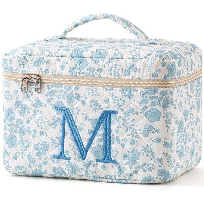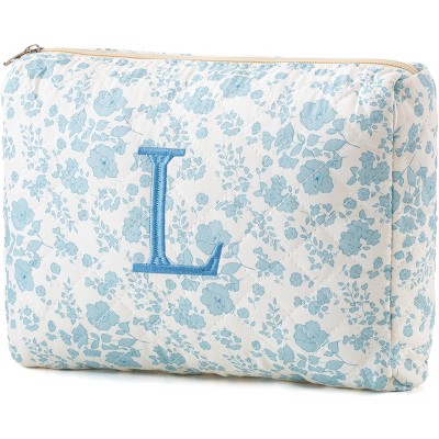 Narwey Initial Quilted Makeup Bag, Cotton Large Travel Makeup Bag, Cute Floral Coquette Make up Bag Cosmetic Bag Toiletry Bag for Women Girls L
