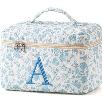 Narwey Initial Quilted Makeup Bag, Cotton Large Travel Make up Bag, Cute Floral Coquette Cosmetic Bag Toiletry Bag for Women Girls A