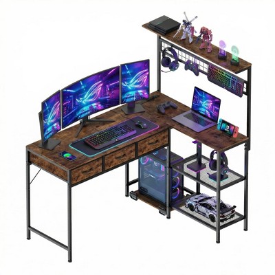 47 Inch Rustic Brown Computer Desk with Charging Station Reversible Gaming Desk LED Lights 5 Fabric Drawers Monitor Stand Home Office Writing Table