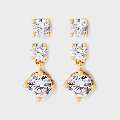 14K Gold Plated & Cubic Zirconia Stud Double Drop Stainless Steel Post Earring Set 2pc - A New Day™ Gold