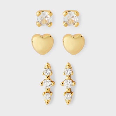 14K Gold Plated & Cubic Zirconia Puff Heart Flat Back Earring Set 3pc - A New Day™ Gold