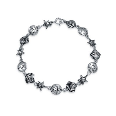 Bling Jewelry Tropical Beach Vacation Nautical Multi Charm Sand Dollar Sea Shell Starfish Link Bracelet Oxidized .925 Sterling Silver 7.5 Inch