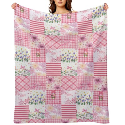 Spring Summer Flannel Blanket Throw, Pink Flowers Patchwork Soft Fuzzy Plush Cozy Blankets for Couch Sofa Bed 40x50 inches
