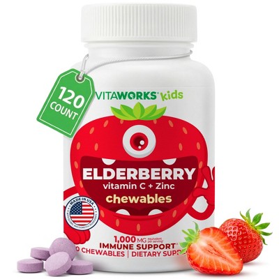 VitaWorks Kids Elderberry Vitamin C and Zinc - Great Tasting Strawberry Flavor Sambucus Elderberry Immune Support for kids - 120 Chewables