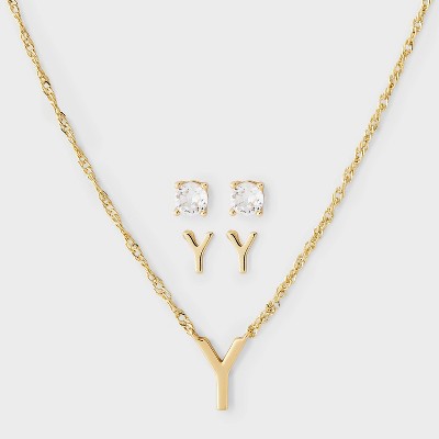 Brass Polished Letter Charm Necklace & Cubic Zirconia Stud Earrings 3pc Set - A New Day™ Gold