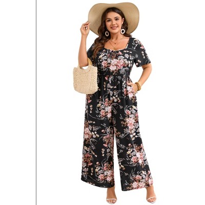 Coolmee Women's Plus Size Floral Jumpsuits Sweetheart Neck Dressy Casual Wide Leg Long Pant Romper with Pockets
