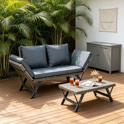 55" Foldable Patio Wicker Bench Convertible Sofa Daybed with Adjustable Armrests, Outdoor Conversation Bench, 1pc