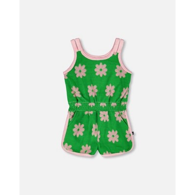 Deux par Deux Girl Terry Cloth Sleeveless Jumpsuit Green Printed Flowers