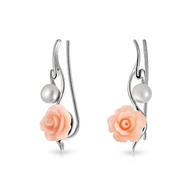 Bling Jewelry Trendy 3D Rose Flower Ear Cuff Cartilage with Pearl Sterling Silver Earrings