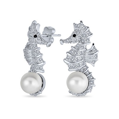 Bling Jewelry Nautical Cubic Zirconia CZ White Simulated Pearl Seahorse Earrings Brass