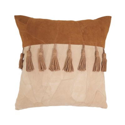 Saro Lifestyle Boho Patchwork Leather Tassel Pillow Cover, 16"x16", Beige