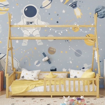 Zeus & Ruta Kids Twin House Bed with Light, Low Floor Design with Fence & Roof for Bedroom, Natural