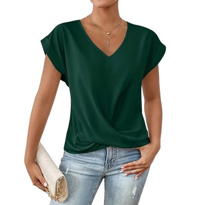 Coolmee Women Summer Casual Shirt Short Sleeve Round Neck T Shirt Front Twist Cap Sleeve Tunic Tops Loose Fitted Shirt