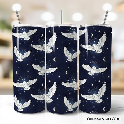 Snowy Owl Under Moon and Stars 20oz Tumbler With Lid & Stainless Steel Straw, Enchanted Navy Night Sky Gift Cup | OrnamentallyYou