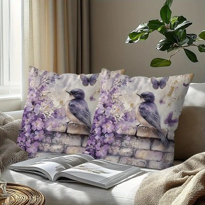Lomsoe 2pcs Flower & Bird Throw Pillow Covers - Purple Pink Floral Design, for Sofa Bed, Machine Washable Decorative Pillows, 18x18Inch.