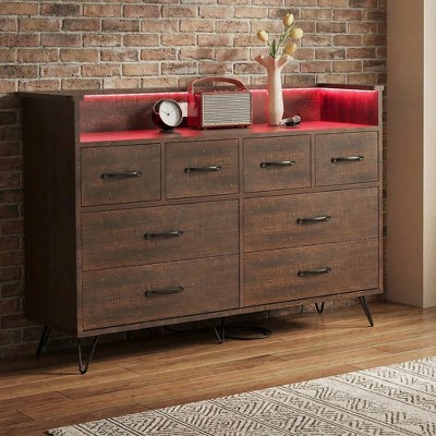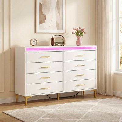 Modern 8-Drawer Storage Cabinet with LED Lights & Charging Station, Wooden Organizer with Open Shelf for Bedroom, Living Room, Entryway