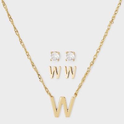 Brass Polished Letter Charm Necklace & Cubic Zirconia Stud Earrings 3pc Set - A New Day™ Gold