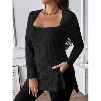 Women's Square Neck Ribbed Slim Fit Long Sleeve Top, Side Slit Tunic Knit Blouse, Casual Stretchy Tunic Shirt for Women, Multiple Colors