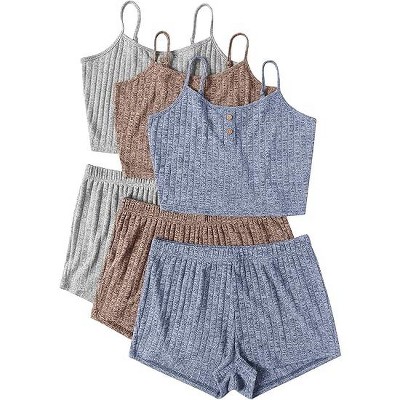 Ekouaer 3 Sets for Women Ribbed Pajamas Crop Cami Top and Shorts Pjs Casual Sleeveless Button Lounge Set Sleepwear