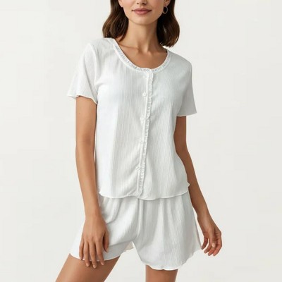 Anna-Kaci Lounge Women's 2-Piece Set Button Front Pajama Top with Round Neck and Relaxed Fit Shorts Textured Sleepwear Set
