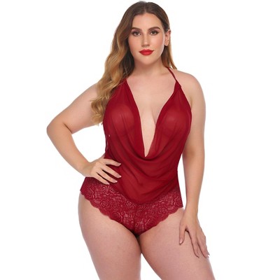 Avidlove Lingerie for Women Lace Clear Bodysuit Deep V Neck Teddy Lingerie One Piece Exotic BabyDoll Dark Red XL