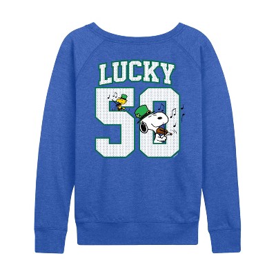 Women's - Peanuts - Lucky Jersey Lightweight French Terry Wide Neck Long Sleeve Graphic Shirt