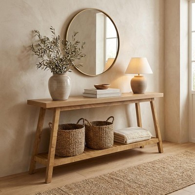 MAYEERTY 63" Wavy Scalloped 2-Tier Console Table, Retro Farmhouse Entryway Table with Natural Wood Grain