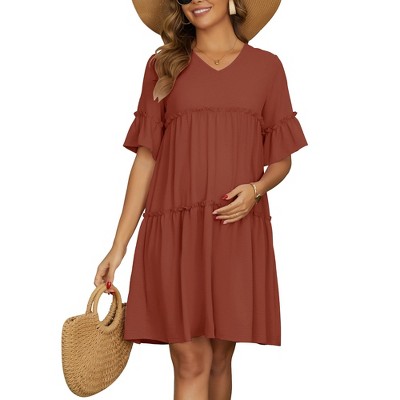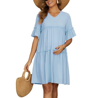 INSPIRE CHIC Women's Maternity Dress Babydoll Bohemian Tiered Ruffled Bell Sleeve Casual V Neck Boho Pregnancy Dresses