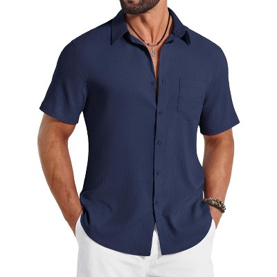 COOFANDY Mens Button Down Shirts Short Sleeve Shirt Casual Summer Beach Textured Shirts with Pocket Navy Blue L