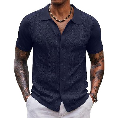 COOFANDY Mens Knit Button Down Short Sleeve Button Up Shirt Summer Casual Beach Tops Navy Blue XXL