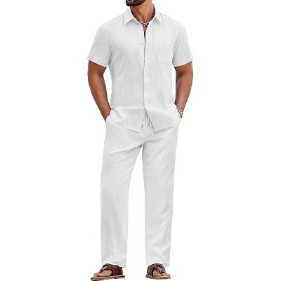 COOFANDY Mens 2 Piece Sets Summer Outfits Short Sleeve Button Down Shirt Loose Pant Sets Beach Vacation Outfits White XL