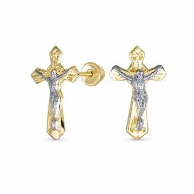 Bling Jewelry Tiny Minimalist Christian Religious Jesus Gold Crucifix Cross Two Tone Yellow 14K Gold Stud Earring Safety Screw Back