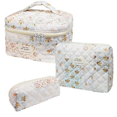 Narwey Large Quilted Makeup Bag, Cute Cotton Travel Cosmetic Bag with Handle, Gifts for Bridesmaids, Portable Coquette Floral Make up Bags