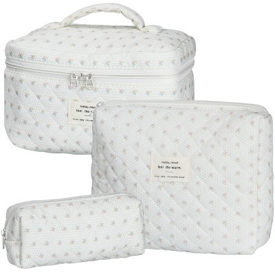 Narwey Quilted Makeup Bag Set - 3 PCS Cute Floral Cotton Makeup Bag, Large Coquette Aesthetic Make up Cosmetic Bag