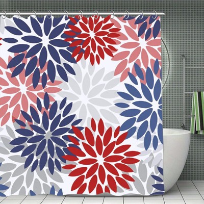 Dahlia Blue Floral Shower Curtains, Red Gray Black Modern Chrisanthemum Flowers Spring Autumn Flowers Bath Curtain 70.8x70.8 Iniches
