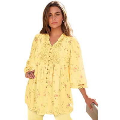 Roaman's Plus Size Juliet Lace Trim Button-Down Shirt 44 W, Banana Wild Flowers