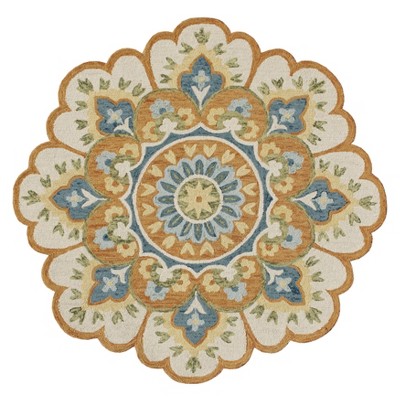 HomeRoots 4' Blue and Orange Round Wool Floral Medallion Hand Tufted Area Rug