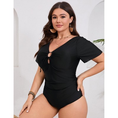 Women Plus Size Swimsuit One Piece V Neck Swimdress, Plus Size Swimsuits Tummy Control Bathing Suits V Neck Ruffle Sleeve Swimwear Suit for Women